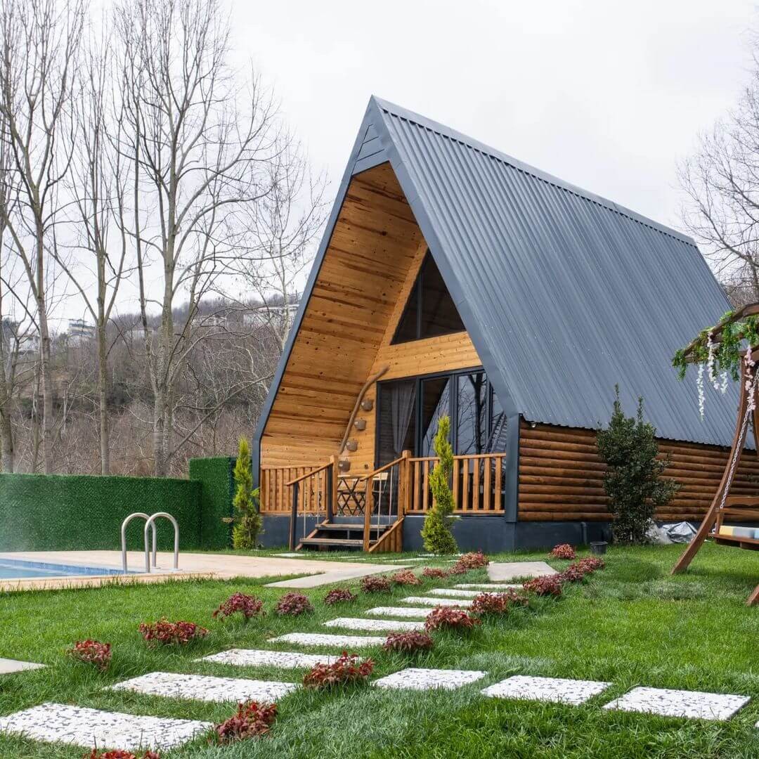 Aile bungalovu Isıtmalı havuz Göl manzarası Şömine Masalı barbekü Ateş çukuru 2+1 78 M² deluxe konsept